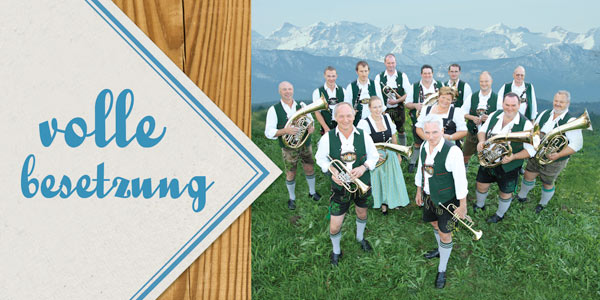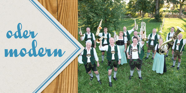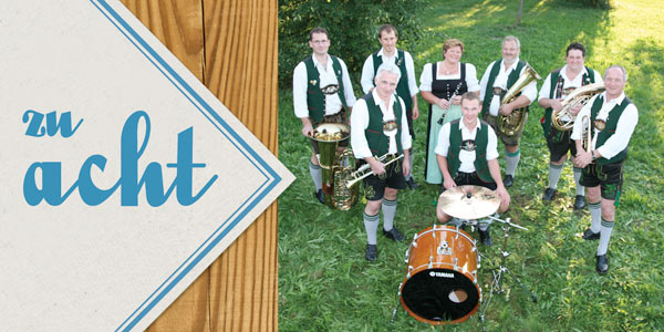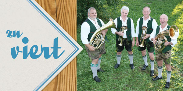 Zu viert, zu sechst, zu acht oder mit allen. Bayrisch, Weisen, Stimmung. Auf jeden Fall aber mit viel Spaß und Elan. Je nach Anlass können wir Ihnen verschiedene Besetzungen und Stilrichtungen anbieten. Welche Besetzung für Ihren Anlass am sinnvollsten ist, klären wir in einem persönlichen Gespräch. Dies hängt von der Art des Auftritts (Anlass, Dauer, Repertoirewünsche etc.) ab. Größere Veranstaltungen können wir mit unserer elektronischen Verstärkeranlage beschallen.